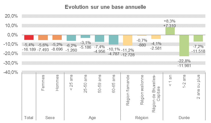 Le chômage complet diminue sur une base annuelle plus vite chez les femmes (-7.493 unités ou -5,6%) que chez les hommes (-8.696 unités ou -5,2%).