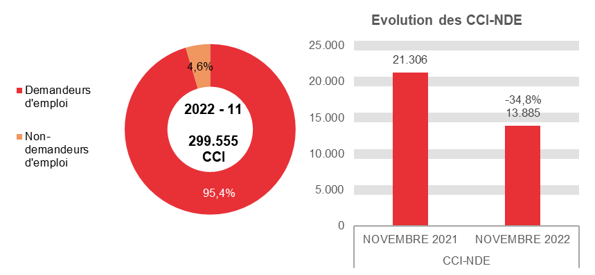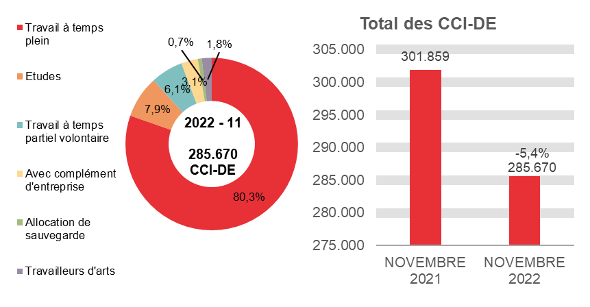 En novembre 2022, 285.670 chômeurs complets indemnisés demandeurs d'emploi (CCI-DE) ont perçu une allocation, soit 16.189 de moins qu'en novembre 2021 (-5,4%). Ces allocataires se répartissent comme suit : 229.505 CCI-DE admis sur la base d'un travail à temps plein, 22.486 admis sur la base des études, 17.349 CCI-DE admis sur la base d'un travail à temps partiel volontaire, 8.955 CCI-DE bénéficiant d'un complément d'entreprise, 2.091 allocations de sauvegarde et 5.284 travailleurs d'arts.