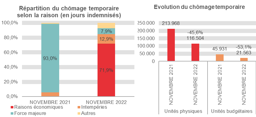 Pour conclure, le chômage temporaire diminue de 97.464 unités, soit de 45,6% par rapport à novembre 2021, lorsque le nombre de chômeurs temporaires était encore fortement influencé par la crise corona. Le nombre de travailleurs en chômage temporaire s'élève à 116.504 unités physiques en novembre 2022, ce qui correspond à 21.563 unités budgétaires compte tenu du nombre limité de jours de chômage au cours du mois. Pour le régime temporaire de chômage temporaire pour les entreprises grandes consommatrices d’énergie, 16.237 paiements ont été effectués ce mois-ci, dont une partie concerne encore des périodes de chômage temporaire en octobre.