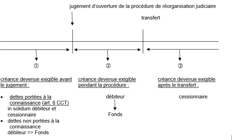 « Les dettes qui deviennent exigibles après la date du jugement d’ouverture de la procédure de réorganisation judiciaire [ou de transfert sous autorité judiciaire] ou, à défaut de ce jugement, après la date du jugement qui ordonne le transfert sous autorité judiciaire, mais avant la date du transfert sous autorité judiciaire, et qui résultent des contrats de travail conclus entre le débiteur et les travailleurs qui seront repris, restent à charge du débiteur. »