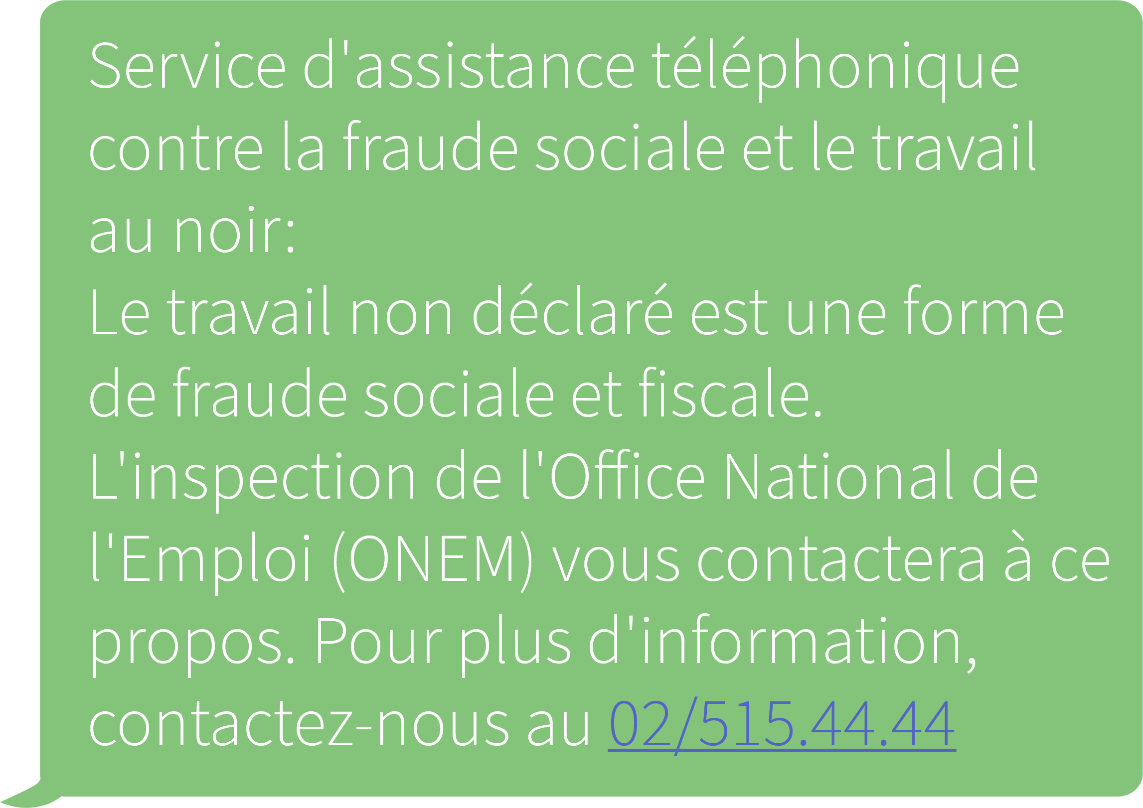 "Service d'assistance téléphonique contre la fraude sociale et le travail au noir : Le travail non déclaré est une forme de fraude sociale et fiscale. L'inspection de L'Office National de l'Emploi (ONEM) vous contactera à ce propos. Pour plus d'information, contactez-nous au 02/515.44.44."
