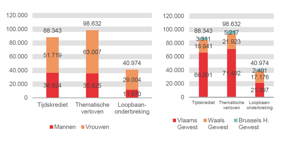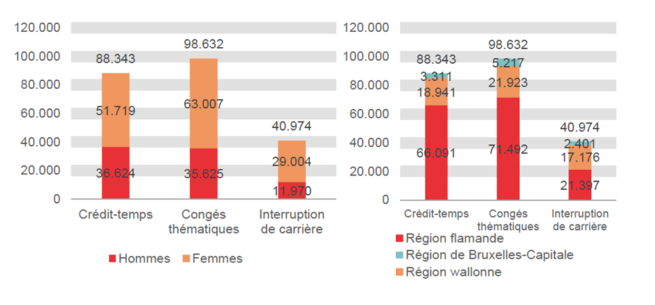 Ce sont davantage les femmes qui prennent les régimes de crédit-temps, de congé thématique ou de l’interruption de carrière. En juillet 2021 il s’agit de 143.730 allocataires féminins (63,1%) contre 84.219 allocataires masculins (36,9%). En outre, c’est surtout en Région flamande qu’on utilise le crédit-temps, les congés thématiques et l’interruption de carrière: en juillet 2021, il s’agit de 158.980 allocataires (69,7%) contre 58.040 en Région wallonne et 10.929 en Région de Bruxelles-Capitale (respectivement 25,5% et 4,8%).