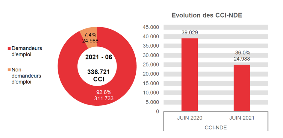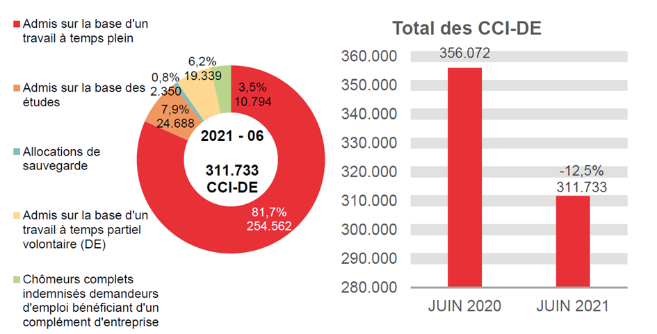 En juin 2021, 311.733 chômeurs complets indemnisés demandeurs d'emploi ont perçu une allocation, soit 44.339 de moins qu'en juin 2020 (-12,5%). Ces 311.733 allocataires se répartissent comme suit : 279.250 chômeurs complets indemnisés demandeurs d'emploi admis sur la base d'un travail à temps plein ou admis sur la base des études, 19.339 chômeurs complets indemnisés demandeurs d'emploi admis sur la base d'un travail à temps partiel volontaire, 10.794 chômeurs complets indemnisés demandeurs d'emploi bénéficiant d'un complément d'entreprise et 2.350 allocations de sauvegarde (nouvelle allocation à partir d'octobre 2020).