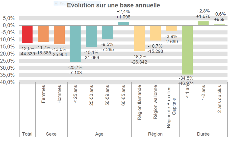 Le chômage complet des jeunes (moins de 25 ans) diminue de 25,7% (-7.103 unités). Le chômage des 25 à 49 ans diminue de 15,1% (-31.069 unités). Dans la classe d'âge des 50 à 59 ans, il baisse de 9,5% (-7.265 unités). Le nombre de chômeurs de 60 ans et plus augmente (+ 2,4% ou +1.098 unités). Il importe toutefois de tenir compte de la modification réglementaire concernant le relèvement de la limite d'âge pour l'obtention d'une dispense d'inscription comme demandeur d'emploi. À partir de 2020, il n’est possible de demander la dispense que sur la base d'une expérience professionnelle d'au moins 44 ans, plus sur la base de l'âge.