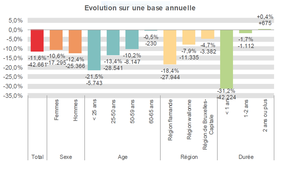Le chômage complet des jeunes (moins de 25 ans) diminue de 21,5% (-5.743 unités). Le chômage des 25 à 49 ans diminue de 13,4% (-28.541 unités). Dans la classe d'âge des 50 à 59 ans, il baisse de 10,2% (-8.147 unités). Le nombre de chômeurs de 60 ans et plus diminue également (-0,5% ou -230 unités). Il importe toutefois de tenir compte de la modification réglementaire concernant le relèvement de la limite d'âge pour l'obtention d'une dispense d'inscription comme demandeur d'emploi. À partir de 2020, il n’est possible de demander la dispense que sur la base d'une expérience professionnelle d'au moins 44 ans, plus sur la base de l'âge.