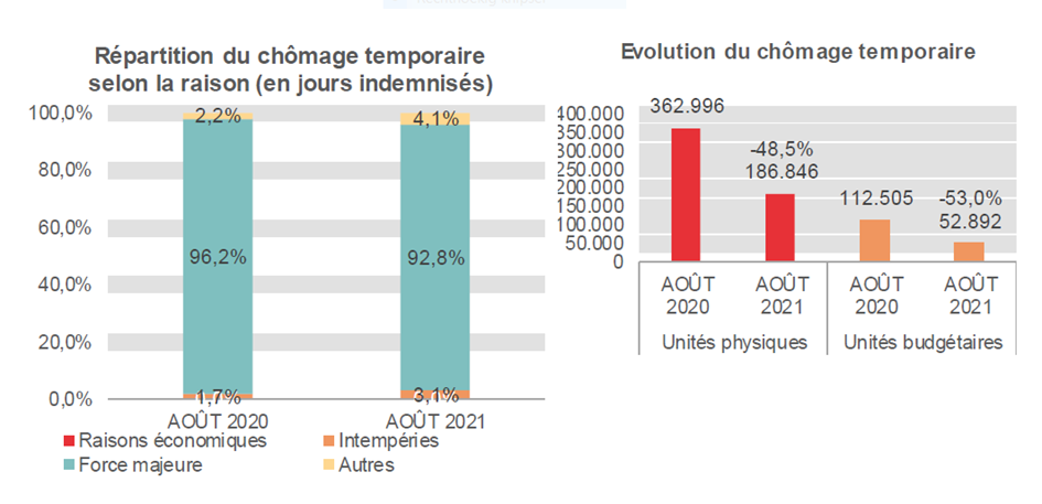 Le nombre de travailleurs en chômage temporaire s'élève à 186.846 unités physiques en août 2021, ce qui correspond à 52.892 unités budgétaires compte tenu du nombre limité de jours de chômage au cours du mois.