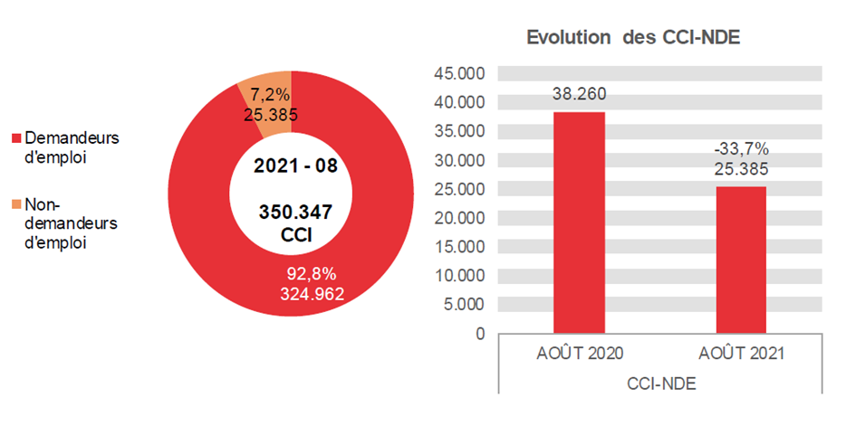 En août 2021, 324.962 chômeurs complets indemnisés demandeurs d'emploi ont perçu une allocation, soit 42.661 de moins qu'en août 2020 (-11,6%). Ces 324.962 allocataires se répartissent comme suit : 291.312 chômeurs complets indemnisés demandeurs d'emploi admis sur la base d'un travail à temps plein ou admis sur la base des études, 20.382 chômeurs complets indemnisés demandeurs d'emploi admis sur la base d'un travail à temps partiel volontaire, 10.910 chômeurs complets indemnisés demandeurs d'emploi bénéficiant d'un complément d'entreprise et 2.358 allocations de sauvegarde (nouvelle allocation à partir d'octobre 2020).
