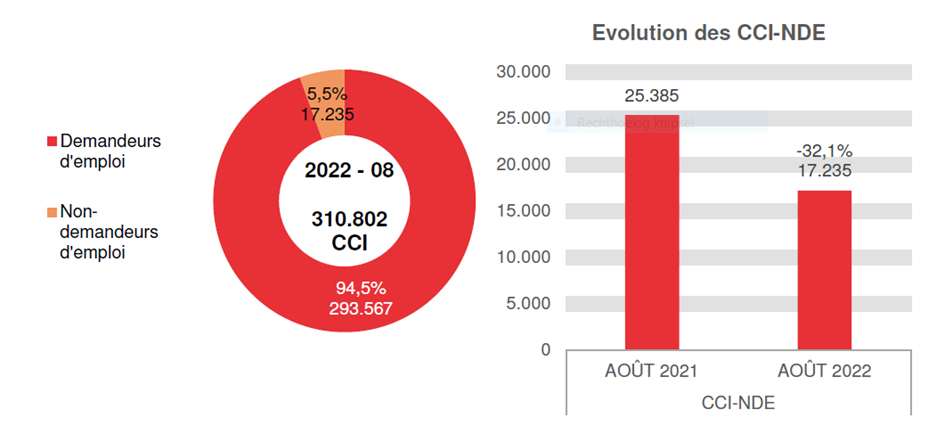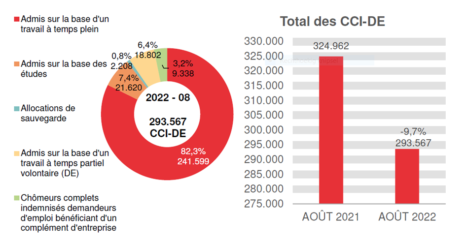 En août 2022, 293.567 chômeurs complets indemnisés demandeurs d'emploi ont perçu une allocation, soit 31.395 de moins qu'en août 2021 (-9,7%). Ces 293.567 allocataires se répartissent comme suit : 263.219 chômeurs complets indemnisés demandeurs d'emploi admis sur la base d'un travail à temps plein ou admis sur la base des études, 18.802 chômeurs complets indemnisés demandeurs d'emploi admis sur la base d'un travail à temps partiel volontaire, 9.338 chômeurs complets indemnisés demandeurs d'emploi bénéficiant d'un complément d'entreprise et 2.208 allocations de sauvegarde.