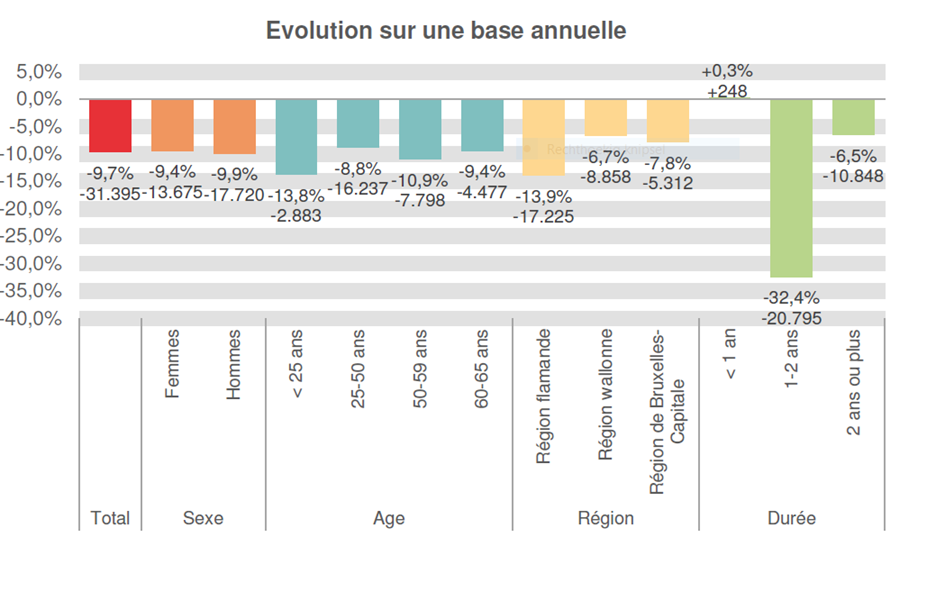 Le chômage complet diminue sur une base annuelle moins vite chez les femmes (-13.675 unités ou -9,4%) que chez les hommes (-17.720 unités ou -9,9%).