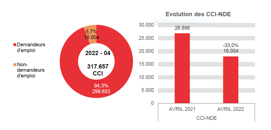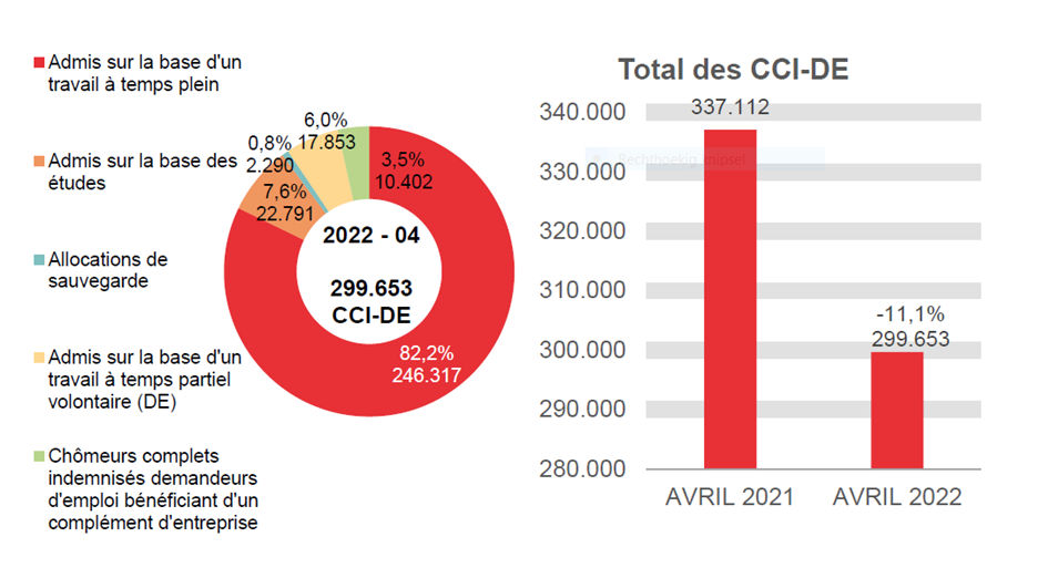 En avril 2022, 299.653 chômeurs complets indemnisés demandeurs d'emploi ont perçu une allocation, soit 37.459 de moins qu'en avril 2021 (-11,1%). Ces 299.653 allocataires se répartissent comme suit : 269.108 chômeurs complets indemnisés demandeurs d'emploi admis sur la base d'un travail à temps plein ou admis sur la base des études, 17.853 chômeurs complets indemnisés demandeurs d'emploi admis sur la base d'un travail à temps partiel volontaire, 10.402 chômeurs complets indemnisés demandeurs d'emploi bénéficiant d'un complément d'entreprise et 2.290 allocations de sauvegarde.