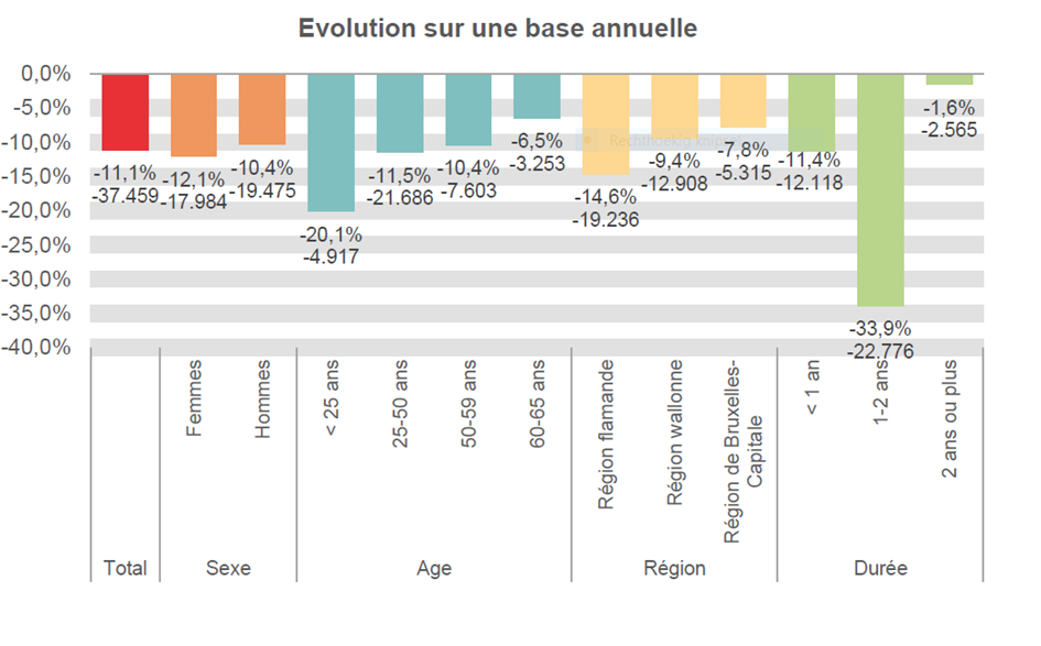 À un an d'intervalle, le chômage complet de courte durée (< 1 an) diminue de 12.118 unités (-11,4%), celui dont la durée est comprise entre 1 et moins de 2 ans diminue également: -22.776 unités (-33,9%). Le chômage de très longue durée (2 ans et plus) diminue de 2.565 unités (-1,6%).