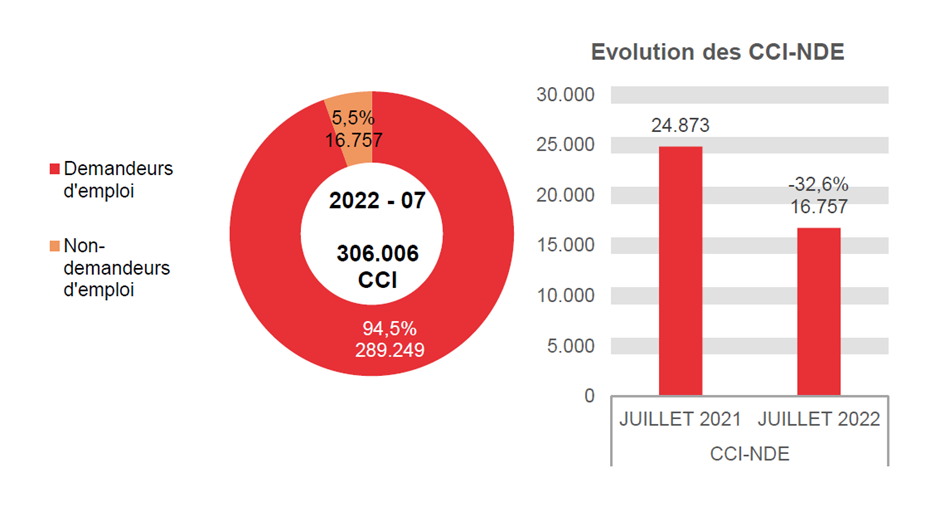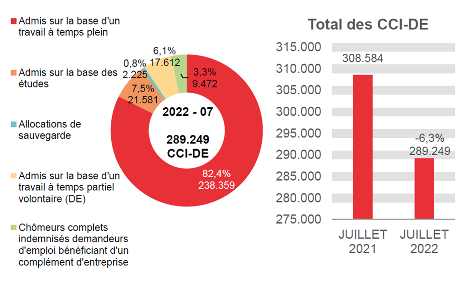 En juillet 2022, 289.249 chômeurs complets indemnisés demandeurs d'emploi ont perçu une allocation, soit 19.335 de moins qu'en juillet 2021 (-6,3%). Ces 289.249 allocataires se répartissent comme suit : 259.940 chômeurs complets indemnisés demandeurs d'emploi admis sur la base d'un travail à temps plein ou admis sur la base des études, 17.612 chômeurs complets indemnisés demandeurs d'emploi admis sur la base d'un travail à temps partiel volontaire, 9.472 chômeurs complets indemnisés demandeurs d'emploi bénéficiant d'un complément d'entreprise et 2.225 allocations de sauvegarde.