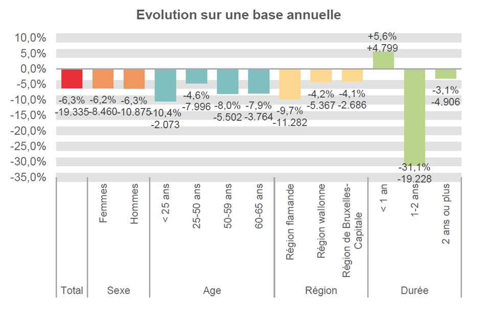 Le chômage complet diminue sur une base annuelle moins vite chez les femmes ( 8.460 unités ou -6,2%) que chez les hommes (-10.875 unités ou -6,3%).