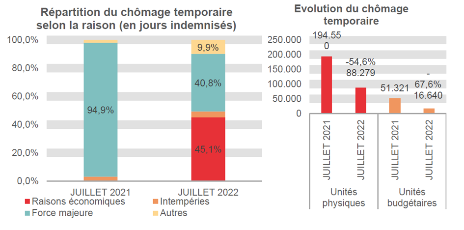 Pour conclure, le chômage temporaire diminue de 106.271 unités sur base annuelle, soit de 54,6%. Les procédures classiques pour l'introduction de chômage temporaire s'applique à nouveau à partir du 1er juillet 2022 et l'on ne peut donc plus faire appel à la procédure simplifiée en matière de chômage temporaire pour force majeure qui s'appliquait depuis mars 2020. (2) Avec la fin de ces mesures de crise, le chômage temporaire retrouve des proportions normales. Leur nombre s'élève à 88.279 unités physiques en juillet 2022, ce qui correspond à 16.640 unités budgétaires compte tenu du nombre limité de jours de chômage au cours du mois. Pour un mois d'été, ces chiffres sont comparables à ceux de l'année 2016. Cependant, la part du chômage temporaire dû à la force majeure reste sensiblement élevée, à 40,8%, alors qu'avant la crise, cette part est toujours restée bien en dessous de 10%.