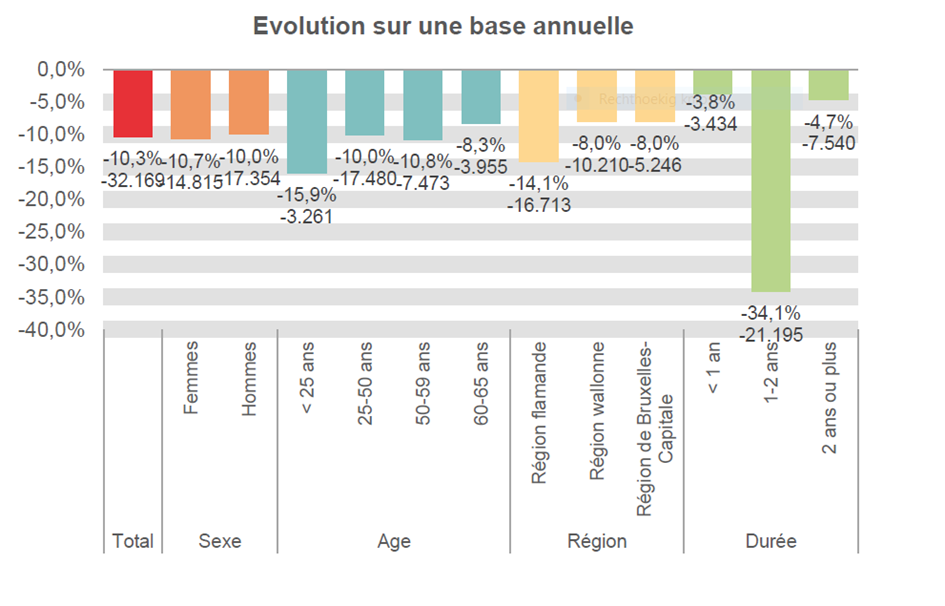À un an d'intervalle, le chômage complet de courte durée (< 1 an) diminue de 3.434 unités (-3,8%), celui dont la durée est comprise entre 1 et moins de 2 ans diminue également: -21.195 unités (-34,1%). Le chômage de très longue durée (2 ans et plus) diminue de 7.540 unités (-4,7%).