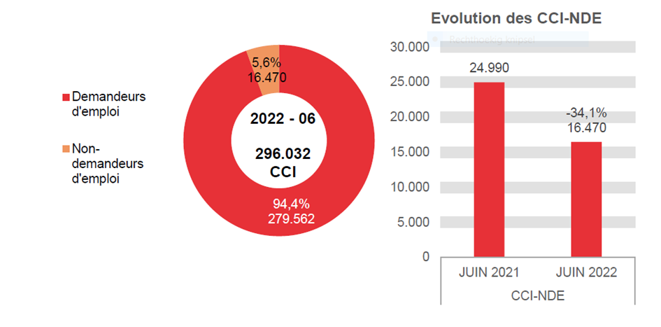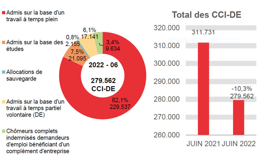 En juin 2022, 279.562 chômeurs complets indemnisés demandeurs d'emploi ont perçu une allocation, soit 32.169 de moins qu'en juin 2021 (-10,3%). Ces 279.562 allocataires se répartissent comme suit : 250.632 chômeurs complets indemnisés demandeurs d'emploi admis sur la base d'un travail à temps plein ou admis sur la base des études, 17.141 chômeurs complets indemnisés demandeurs d'emploi admis sur la base d'un travail à temps partiel volontaire, 9.634 chômeurs complets indemnisés demandeurs d'emploi bénéficiant d'un complément d'entreprise et 2.155 allocations de sauvegarde.