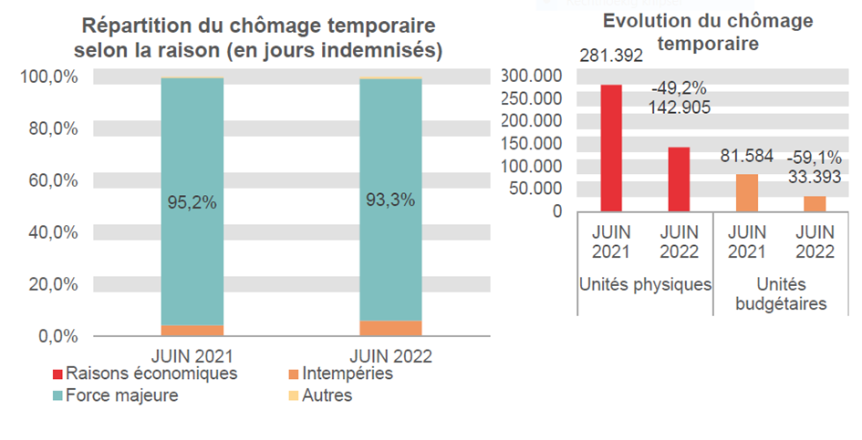 Pour conclure, le chômage temporaire diminue de 138.487 unités sur base annuelle, soit de 49,2%. Le nombre de travailleurs en chômage temporaire s'élève à 142.905 unités physiques en juin 2022, ce qui correspond à 33.393 unités budgétaires compte tenu du nombre limité de jours de chômage au cours du mois.