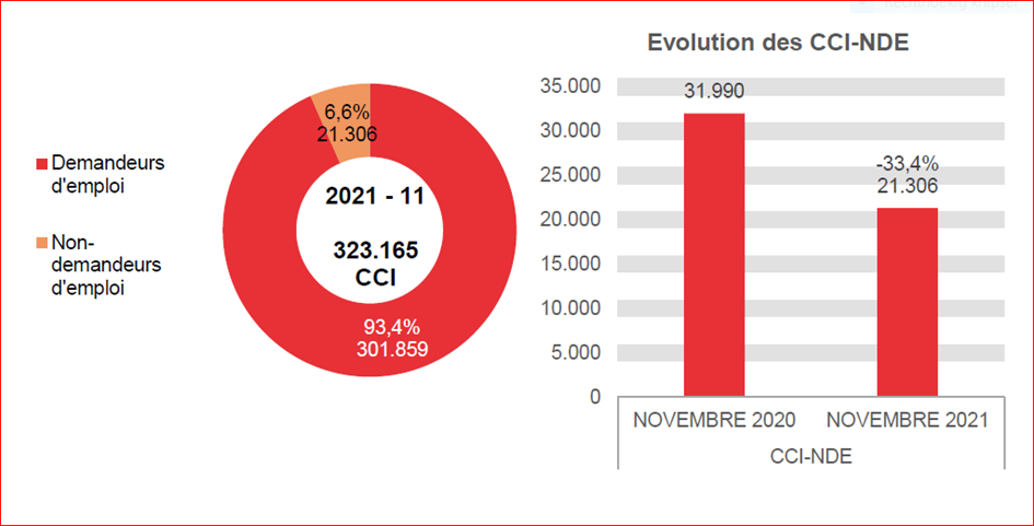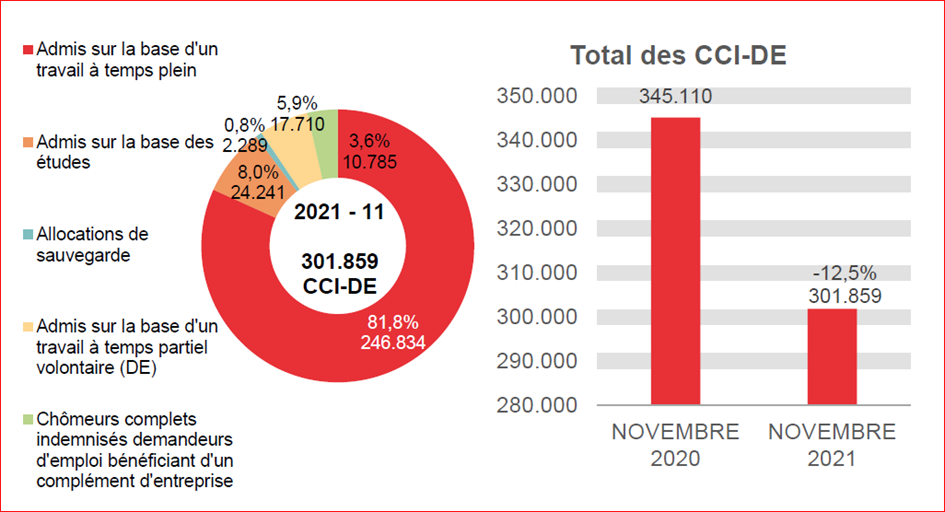 En novembre 2021, 301.859 chômeurs complets indemnisés demandeurs d'emploi ont perçu une allocation, soit 43.251 de moins qu'en novembre 2020 (-12,5%). Ces 301.859 allocataires se répartissent comme suit : 271.075 chômeurs complets indemnisés demandeurs d'emploi admis sur la base d'un travail à temps plein ou admis sur la base des études, 17.710 chômeurs complets indemnisés demandeurs d'emploi admis sur la base d'un travail à temps partiel volontaire, 10.785 chômeurs complets indemnisés demandeurs d'emploi bénéficiant d'un complément d'entreprise et 2.289 allocations de sauvegarde (nouvelle allocation à partir d'octobre 2020).