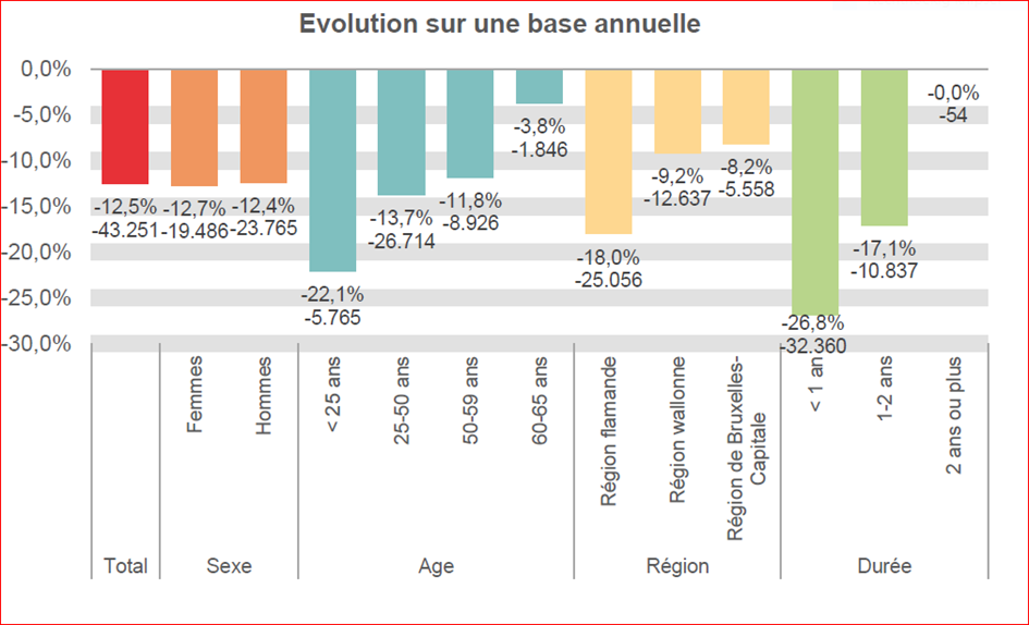 Le chômage complet des jeunes (moins de 25 ans) diminue de 22,1% (-5.765 unités). Le chômage des 25 à 49 ans diminue de 13,7% (-26.714 unités). Dans la classe d'âge des 50 à 59 ans, il baisse de 11,8% (-8.926 unités). Le nombre de chômeurs de 60 ans et plus diminue également (+ 3,8% ou -1.846 unités). Il importe toutefois de tenir compte de la modification réglementaire concernant le relèvement de la limite d'âge pour l'obtention d'une dispense d'inscription comme demandeur d'emploi. À partir de 2020, il n’est possible de demander la dispense que sur la base d'une expérience professionnelle d'au moins 44 ans, plus sur la base de l'âge.