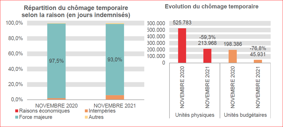 Pour conclure, le chômage temporaire diminue de 311.815 unités sur base annuelle, soit de 59,3%. Le nombre de travailleurs en chômage temporaire s'élève à 213.968 unités physiques en novembre 2021, ce qui correspond à 45.931 unités budgétaires compte tenu du nombre limité de jours de chômage au cours du mois.