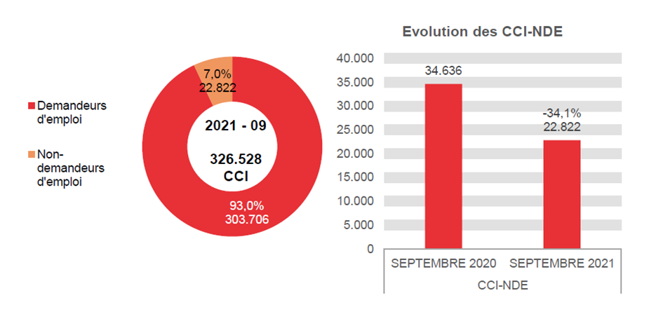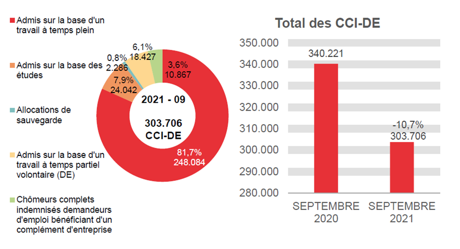 En septembre 2021, 303.706 chômeurs complets indemnisés demandeurs d'emploi ont perçu une allocation, soit 36.515 de moins qu'en septembre 2020 (-10,7%). Ces 303.706 allocataires se répartissent comme suit : 272.126 chômeurs complets indemnisés demandeurs d'emploi admis sur la base d'un travail à temps plein ou admis sur la base des études, 18.427 chômeurs complets indemnisés demandeurs d'emploi admis sur la base d'un travail à temps partiel volontaire, 10.867 chômeurs complets indemnisés demandeurs d'emploi bénéficiant d'un complément d'entreprise et 2.286 allocations de sauvegarde (nouvelle allocation à partir d'octobre 2020).