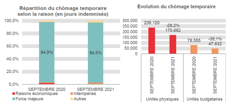 Pour conclure, le chômage temporaire diminue de 67.238 unités sur base annuelle, soit de 28,2%. Le nombre de travailleurs en chômage temporaire s'élève à 170.882 unités physiques en septembre 2021, ce qui correspond à 47.832 unités budgétaires compte tenu du nombre limité de jours de chômage au cours du mois.