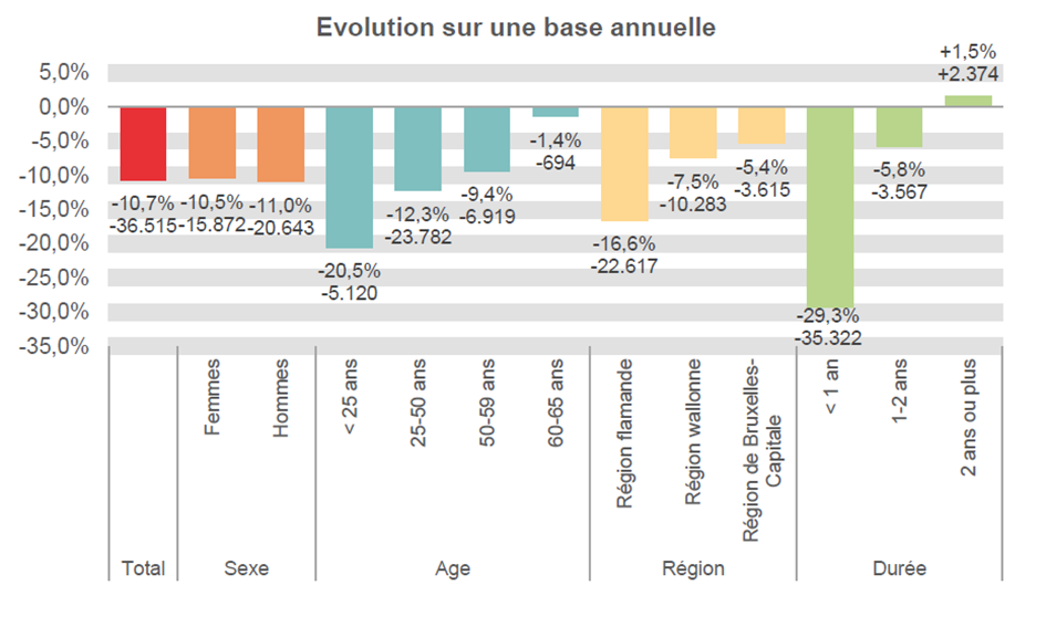 Le chômage complet des jeunes (moins de 25 ans) diminue de 20,5% (-5.120 unités). Le chômage des 25 à 49 ans diminue de 12,3% (-23.782 unités). Dans la classe d'âge des 50 à 59 ans, il baisse de 9,4% (-6.919 unités). Le nombre de chômeurs de 60 ans et plus diminue également (-1,4% ou -694 unités). Il importe toutefois de tenir compte de la modification réglementaire concernant le relèvement de la limite d'âge pour l'obtention d'une dispense d'inscription comme demandeur d'emploi. À partir de 2020, il n’est possible de demander la dispense que sur la base d'une expérience professionnelle d'au moins 44 ans, plus sur la base de l'âge.