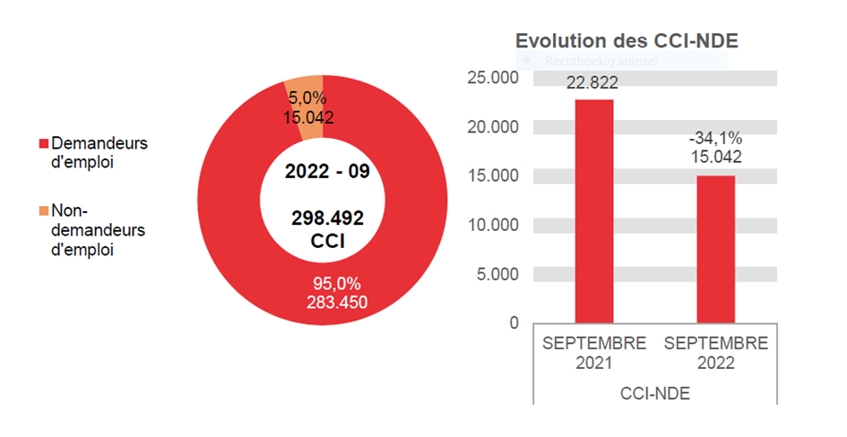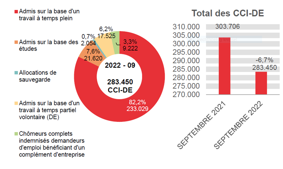 En septembre 2022, 283.450 chômeurs complets indemnisés demandeurs d'emploi ont perçu une allocation, soit 20.256 de moins qu'en septembre 2021 (-6,7%). Ces 283.450 allocataires se répartissent comme suit : 254.649 chômeurs complets indemnisés demandeurs d'emploi admis sur la base d'un travail à temps plein ou admis sur la base des études, 17.525 chômeurs complets indemnisés demandeurs d'emploi admis sur la base d'un travail à temps partiel volontaire, 9.222 chômeurs complets indemnisés demandeurs d'emploi bénéficiant d'un complément d'entreprise et 2.054 allocations de sauvegarde.