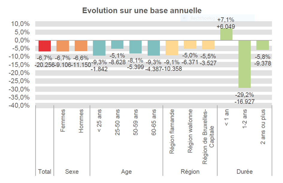 À un an d'intervalle, le chômage complet de courte durée (< 1 an) augmente de 6.049 unités (+7,1%), mais celui dont la durée est comprise entre 1 et moins de 2 ans diminue: -16.927 unités (-29,2%). Le chômage de très longue durée (2 ans et plus) diminue de 9.378 unités (-5,8%).
