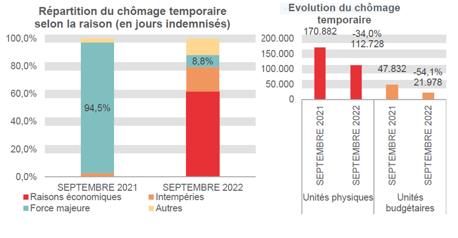 Pour conclure, le chômage temporaire diminue de 58.154 unités sur base annuelle, soit de 34,0%. Le nombre de travailleurs en chômage temporaire s'élève à 112.728 unités physiques en septembre 2022, ce qui correspond à 21.978 unités budgétaires compte tenu du nombre limité de jours de chômage au cours du mois.