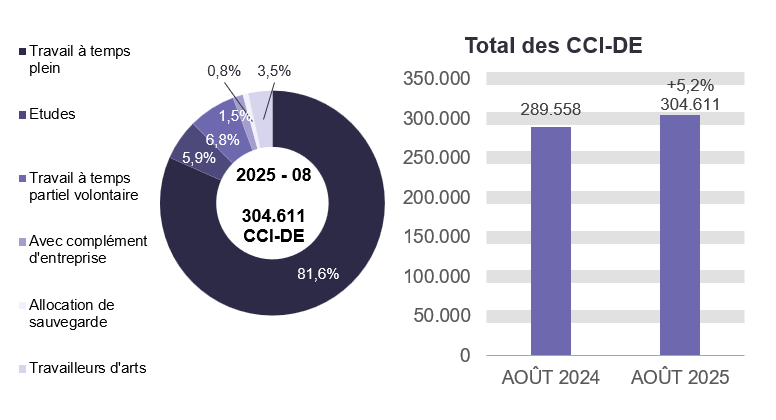 En août 2025, 304.611 chômeurs complets indemnisés demandeurs d'emploi (CCI-DE) ont perçu une allocation, soit 15.053 de plus qu'en août 2024 (+5,2%). Ces allocataires se répartissent comme suit : 248.673 CCI-DE admis sur la base d'un travail à temps plein, 17.892 admis sur la base des études, 20.664 CCI-DE admis sur la base d'un travail à temps partiel volontaire, 4.430 CCI-DE bénéficiant d'un complément d'entreprise, 2.418 allocations de sauvegarde et 10.534 travailleurs d'arts.