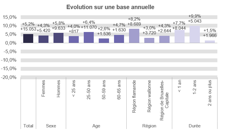 À un an d'intervalle, le chômage complet de courte durée (< 1 an) augmente de 8.044 unités (+7,7%), celui dont la durée est comprise entre 1 et moins de 2 ans augmente également: +5.043 unités (+9,9%). Le chômage de très longue durée (2 ans et plus) augmente de 1.966 unités (+1,5%).