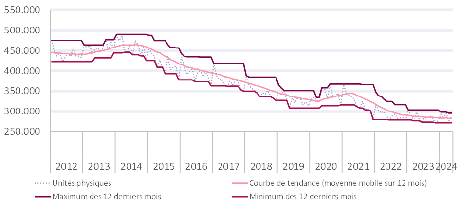 Même si le nombre de chômeurs augmente ou diminue globalement, on observe toujours des variations au cours de l'année. Ces derniers mois, le niveau de chômage se stabilise. Il y a toujours des variations d'un mois à l'autre, mais les écarts deviennent moins importants : les niveaux de chômage minimaux et maximaux récemment enregistrés se rapprochent.