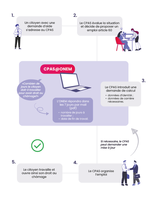En premier lieu, il y a une décision de l'agent du CPAS de proposer un contrat article 60. L'application CPAS@ONEM leur permet d'introduire une demande auprès de l’ONEM pour connaître la durée que doit durer ce contrat avant que la personne puisse bénéficier des allocations de chômage.