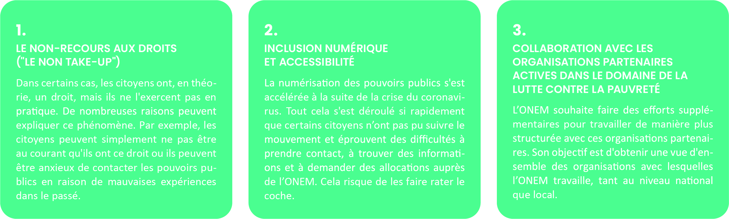 - Collaboration avec les organisations partenaires actives dans le domaine de la lutte contre la pauvreté : L’ONEM souhaite faire des efforts supplémentaires pour travailler de manière plus structurée avec ces organisations partenaires. Son objectif est d'obtenir une vue d'ensemble des organisations avec lesquelles l’ONEM travaille, tant au niveau national que local.