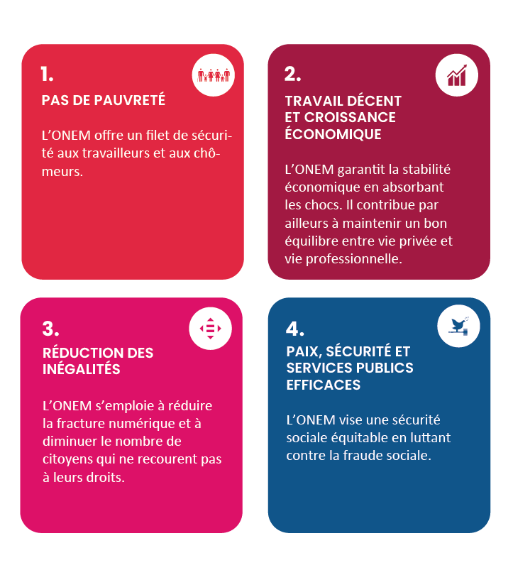 - Paix, sécurité et services publics efficaces : L'ONEM contribue à la répartition équitable de la sécurité sociale en lutant contre la fraude sociale.