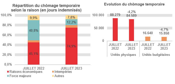 Pour conclure, le chômage temporaire diminue de 3.690 unités sur base annuelle, soit de 4,2%. Le nombre de travailleurs en chômage temporaire s'élève à 84.589 unités physiques en juillet 2023, ce qui correspond à 15.858 unités budgétaires compte tenu du nombre limité de jours de chômage au cours du mois.