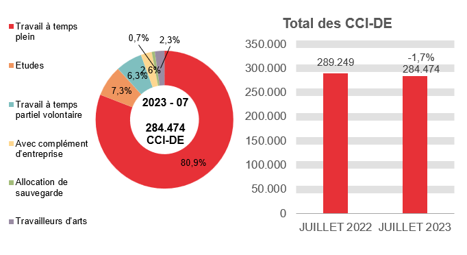 En juillet 2023, 284.474 chômeurs complets indemnisés demandeurs d'emploi (CCI-DE) ont perçu une allocation, soit 4.775 de moins qu'en juillet 2022 (-1,7%). Ces allocataires se répartissent comme suit : 230.137 CCI-DE admis sur la base d'un travail à temps plein, 20.778 admis sur la base des études, 17.789 CCI-DE admis sur la base d'un travail à temps partiel volontaire, 7.283 CCI-DE bénéficiant d'un complément d'entreprise, 2.081 allocations de sauvegarde et 6.406 travailleurs d'arts.